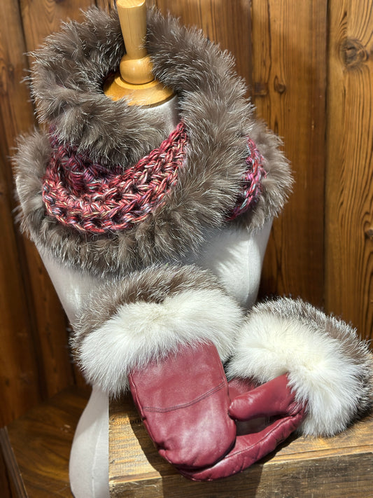 Ensemble Foulard et mitaines Rose avec fourrure recyclée - Renard