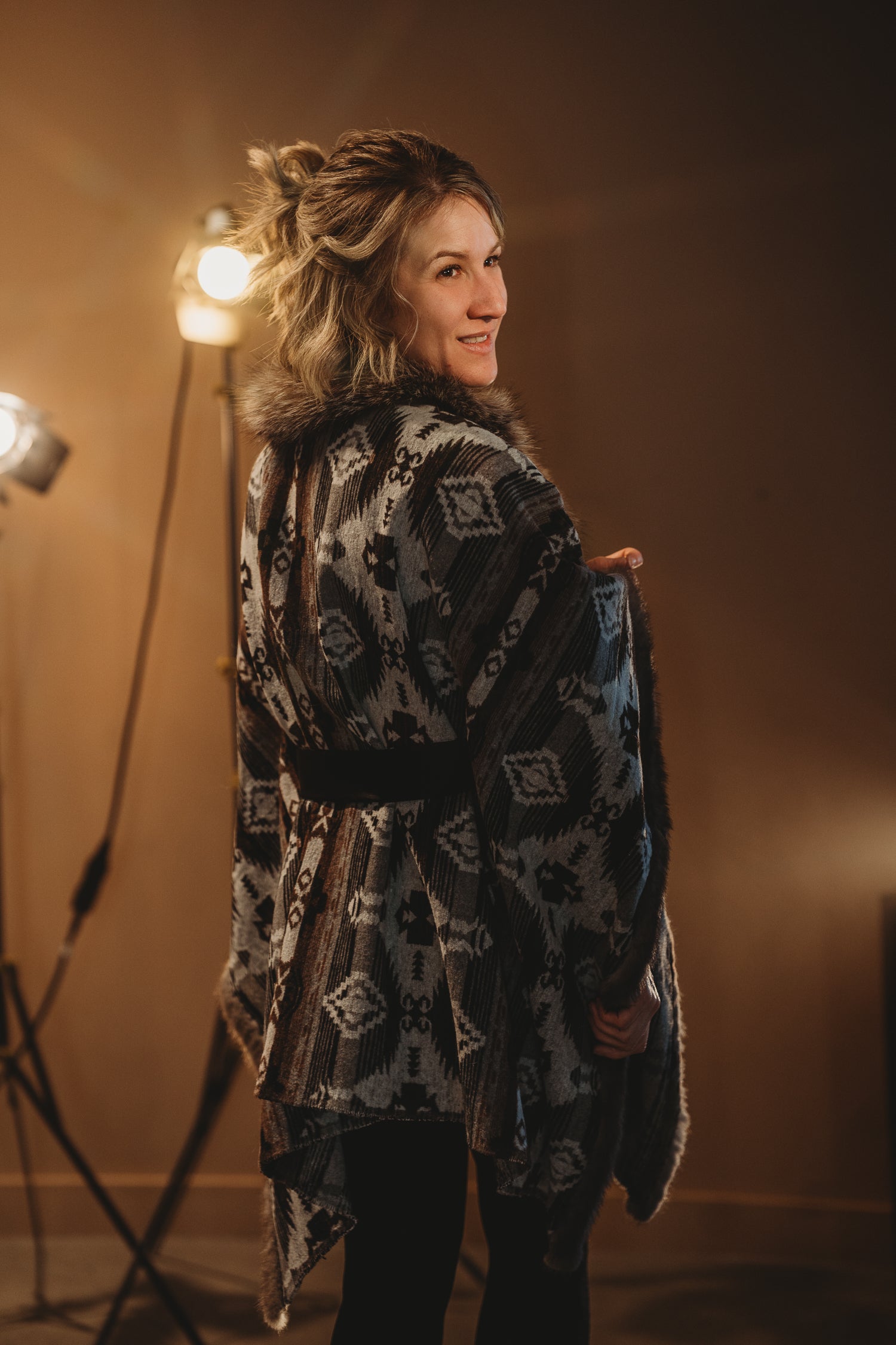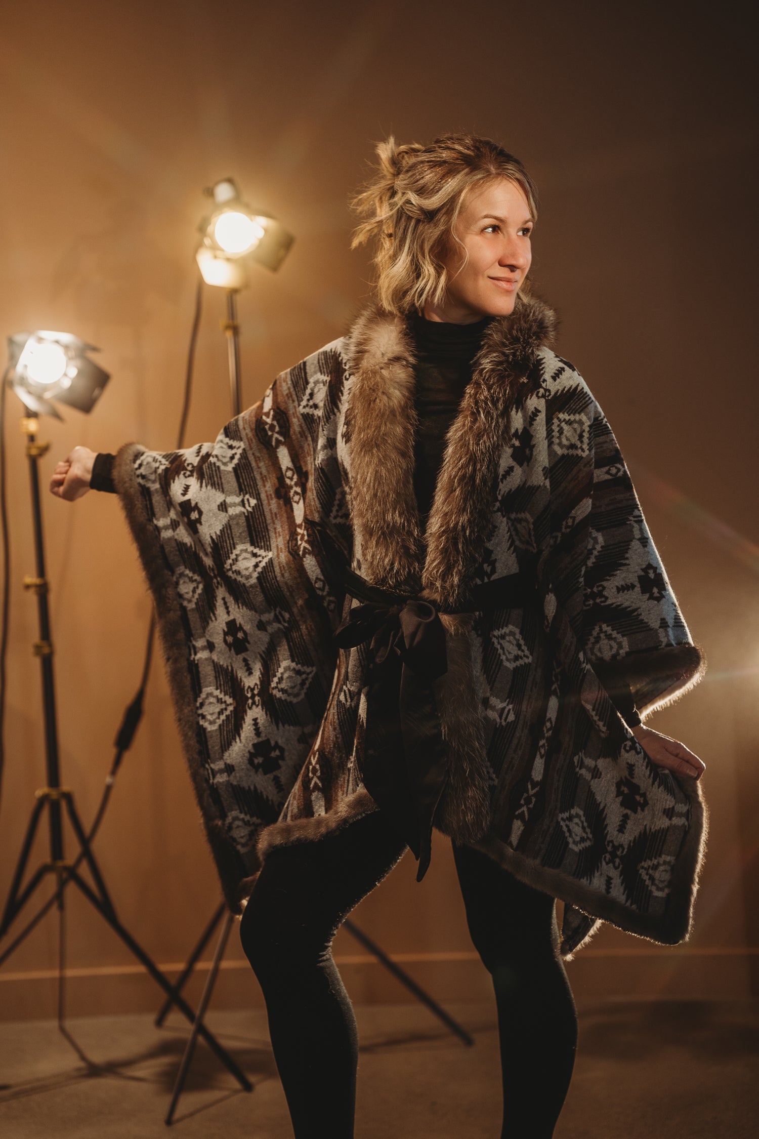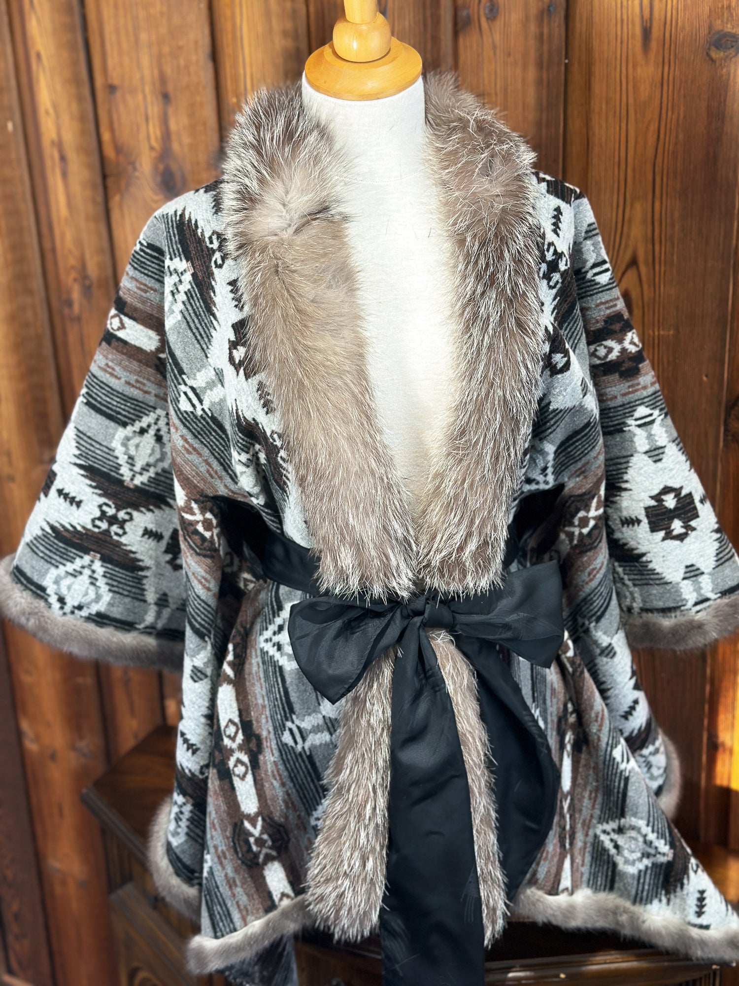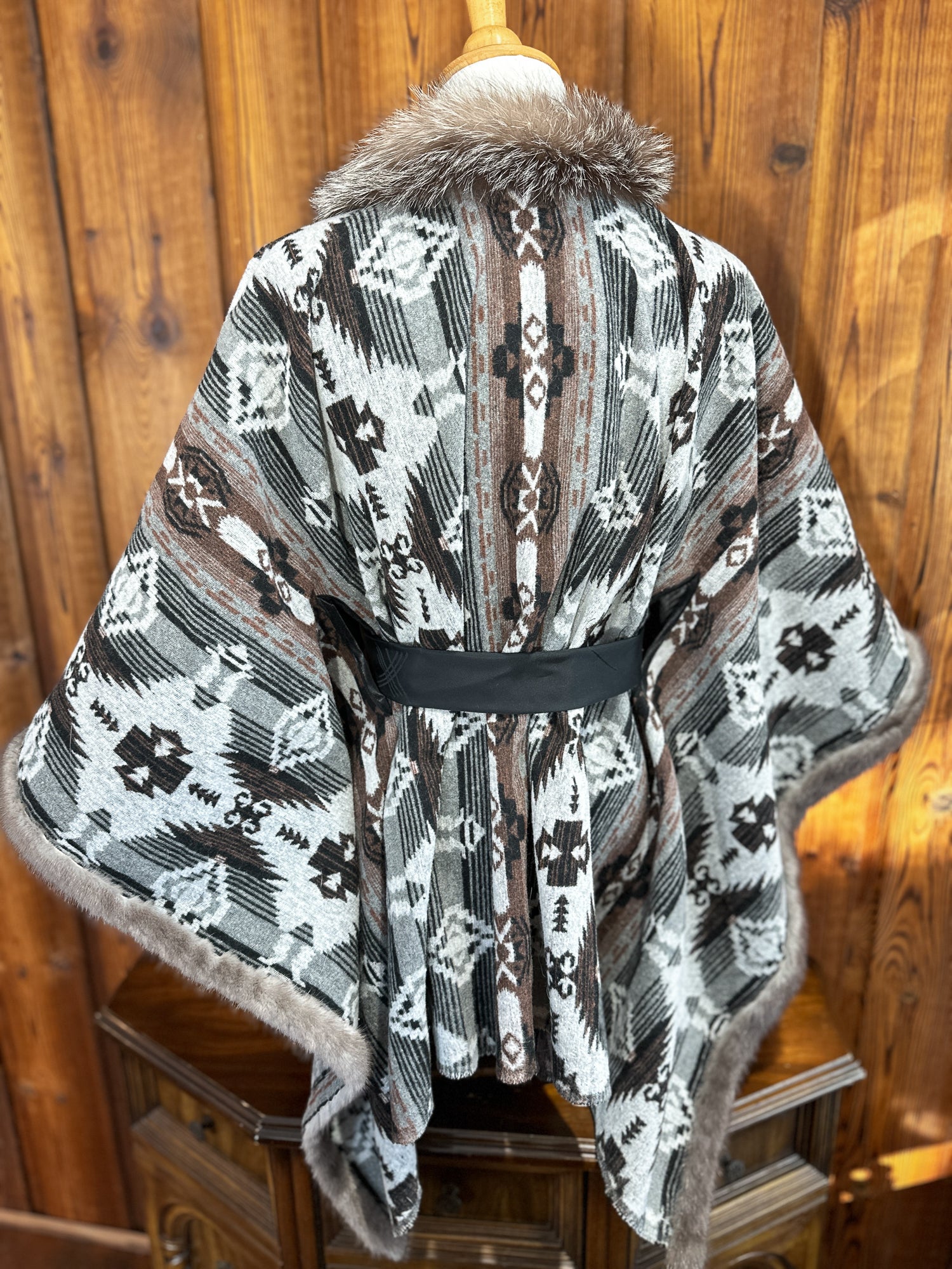Châle agrémenté d'une bande de fourrure recyclée au contour.