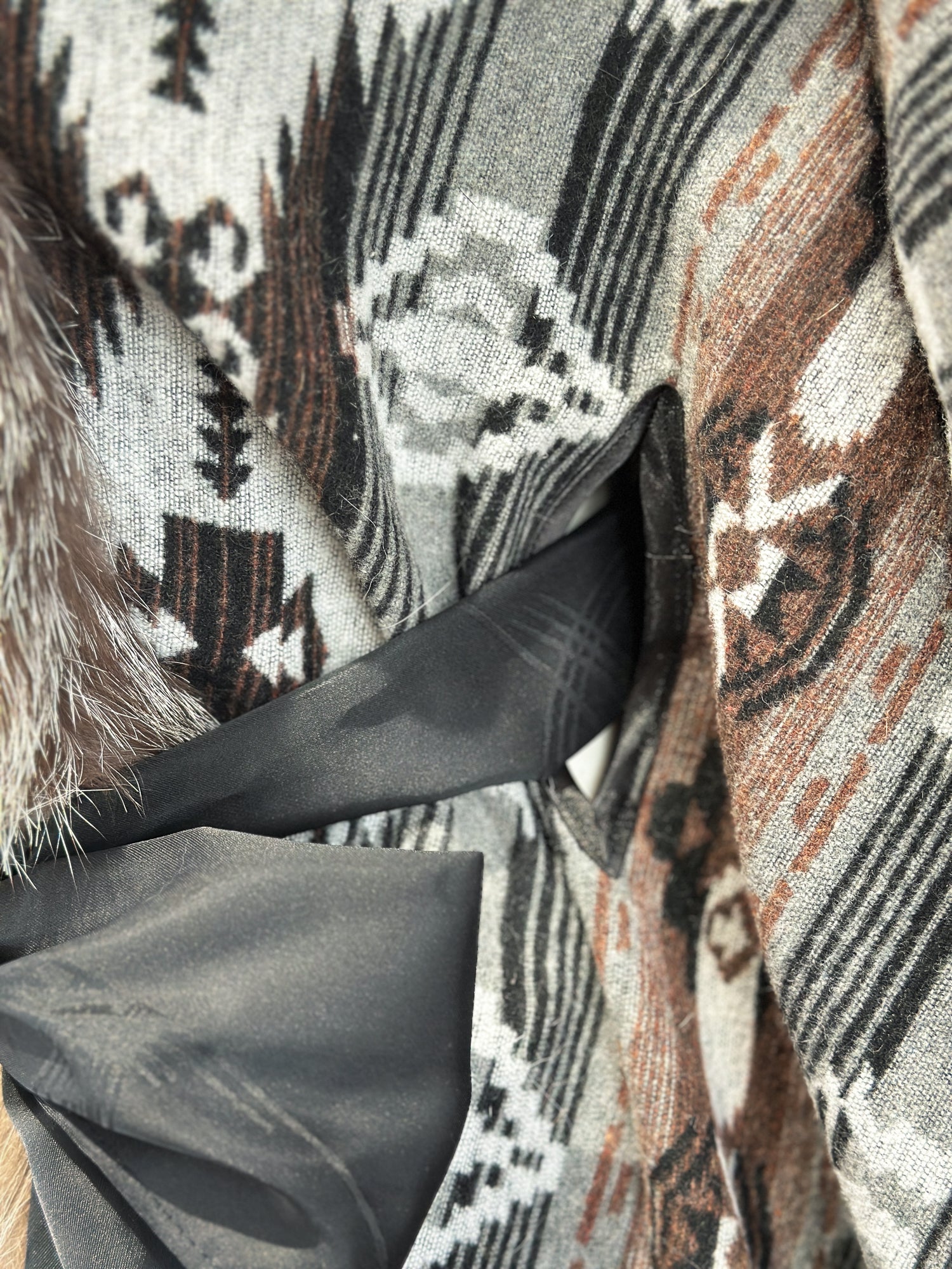 Une large bande de renard au niveau de l'ouverture au cou et une fine bande de vison gris sur les côtés et au bas sur le devant.