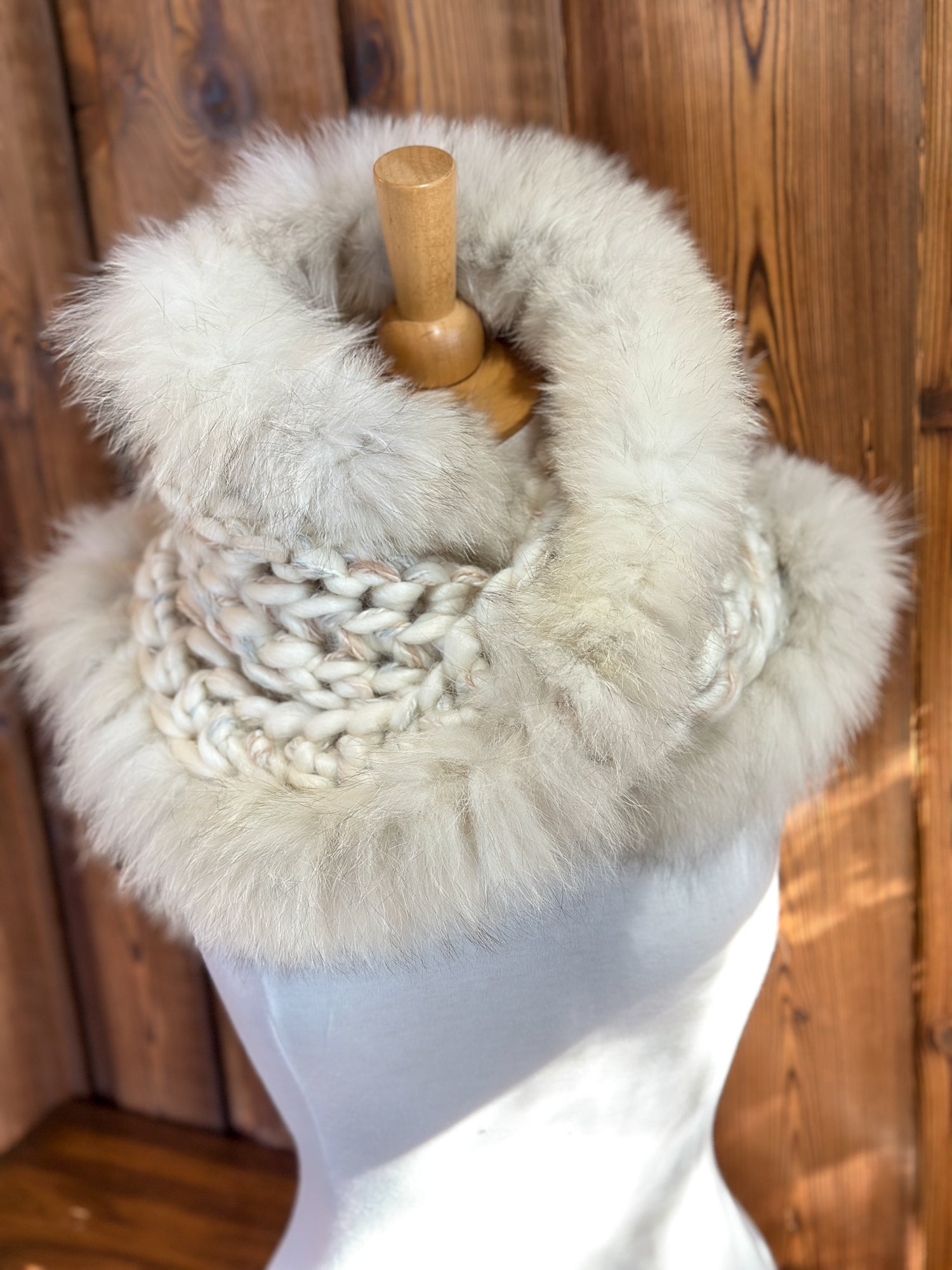 - Foulard: 70% laine de mérino 20% acrylique 10% coton Fourrure recyclée, Renard