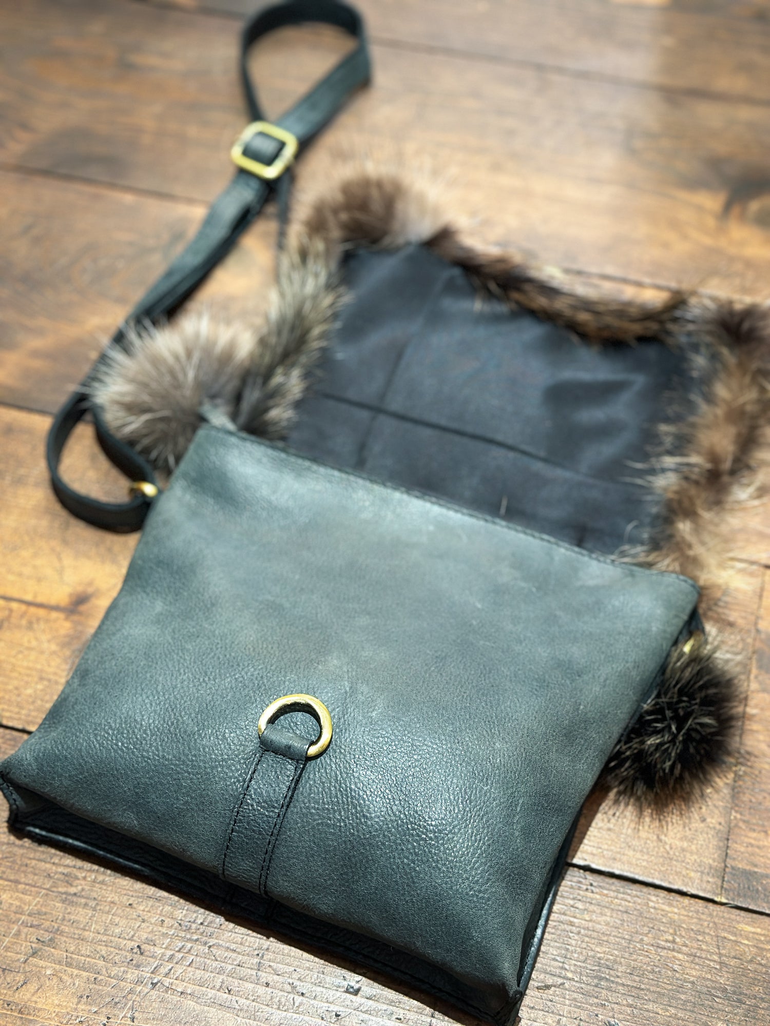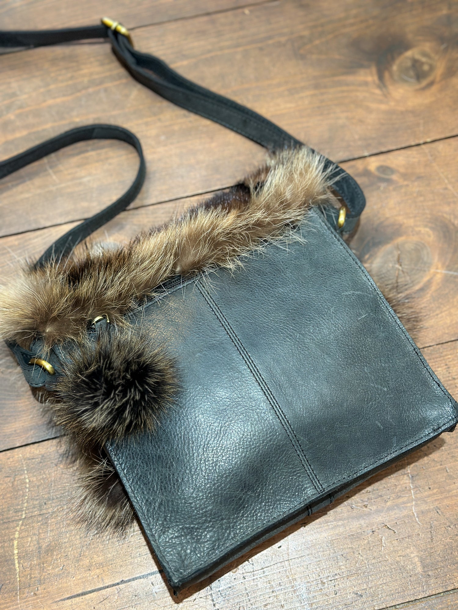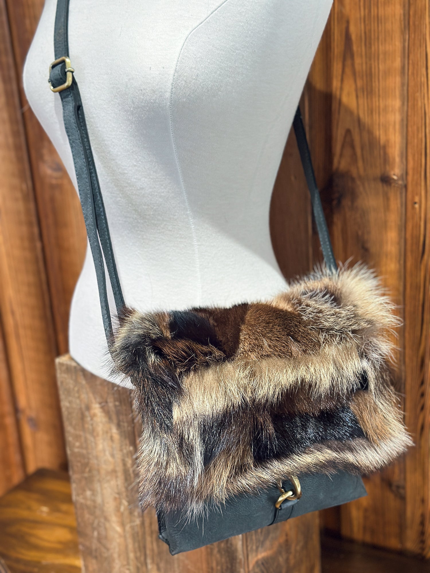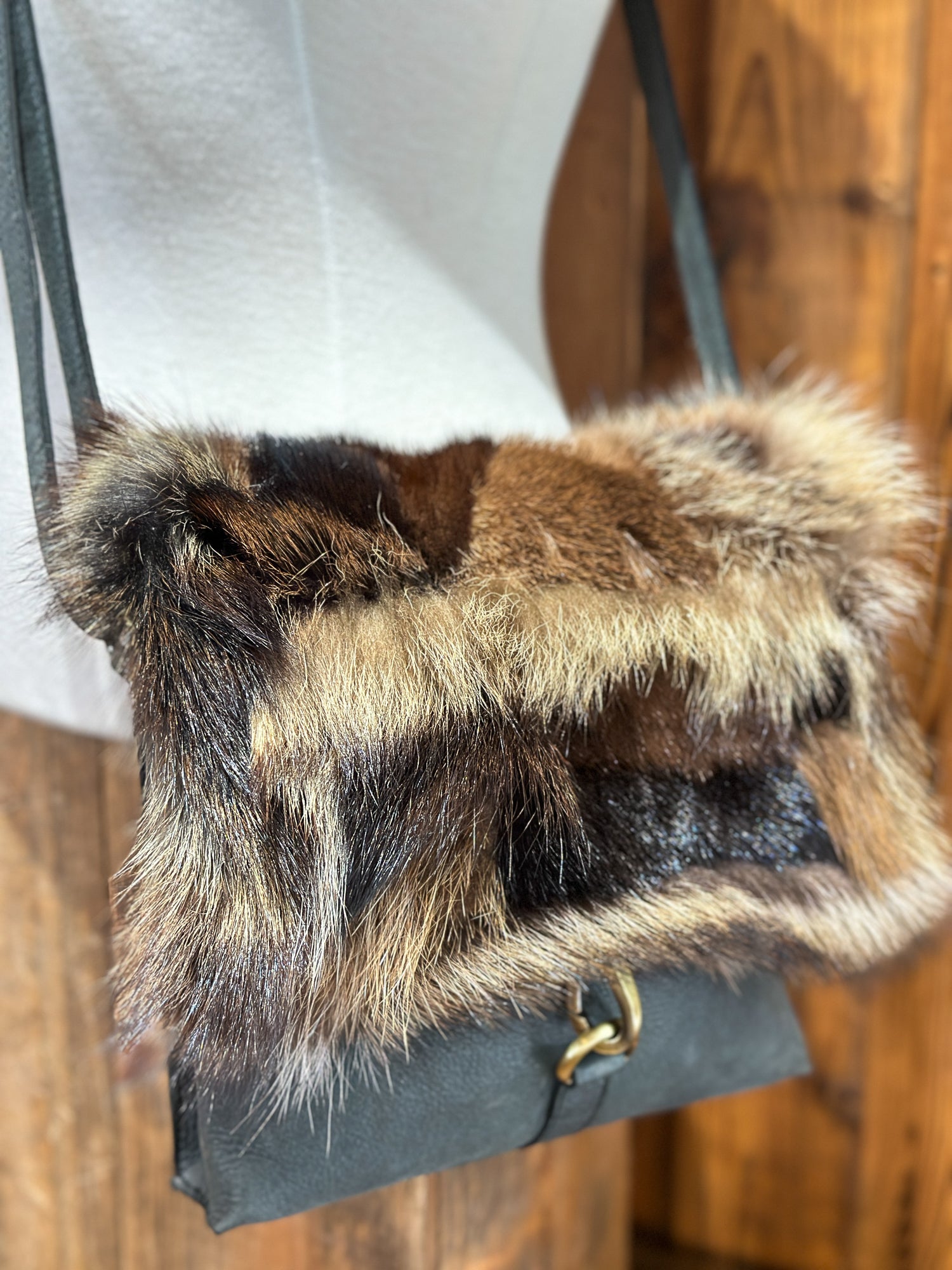 Sac à main en cuir véritable, agrémenté d'un rabat unique en fourrure recyclée. Chaque pièce est unique, créée à partir d'une mosaïque de retailles de fourrure assemblées avec soin pour former une façade originale.