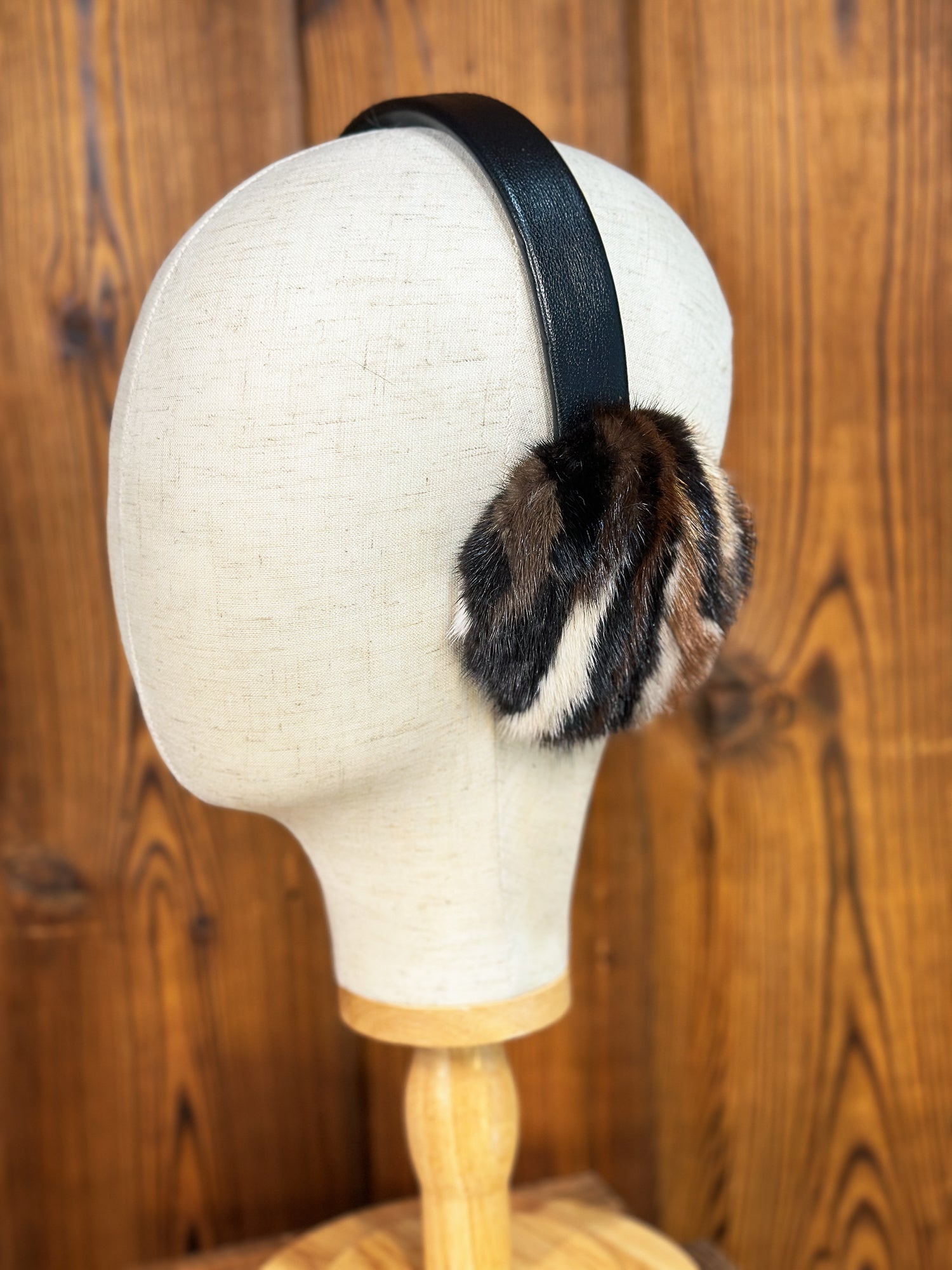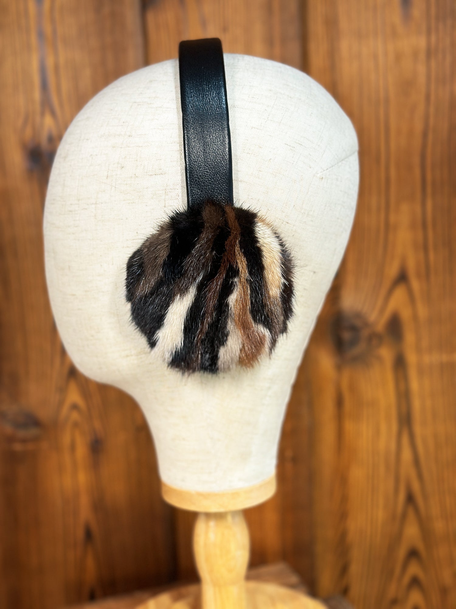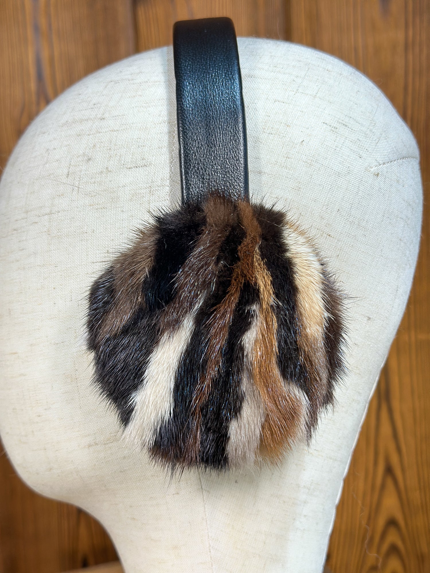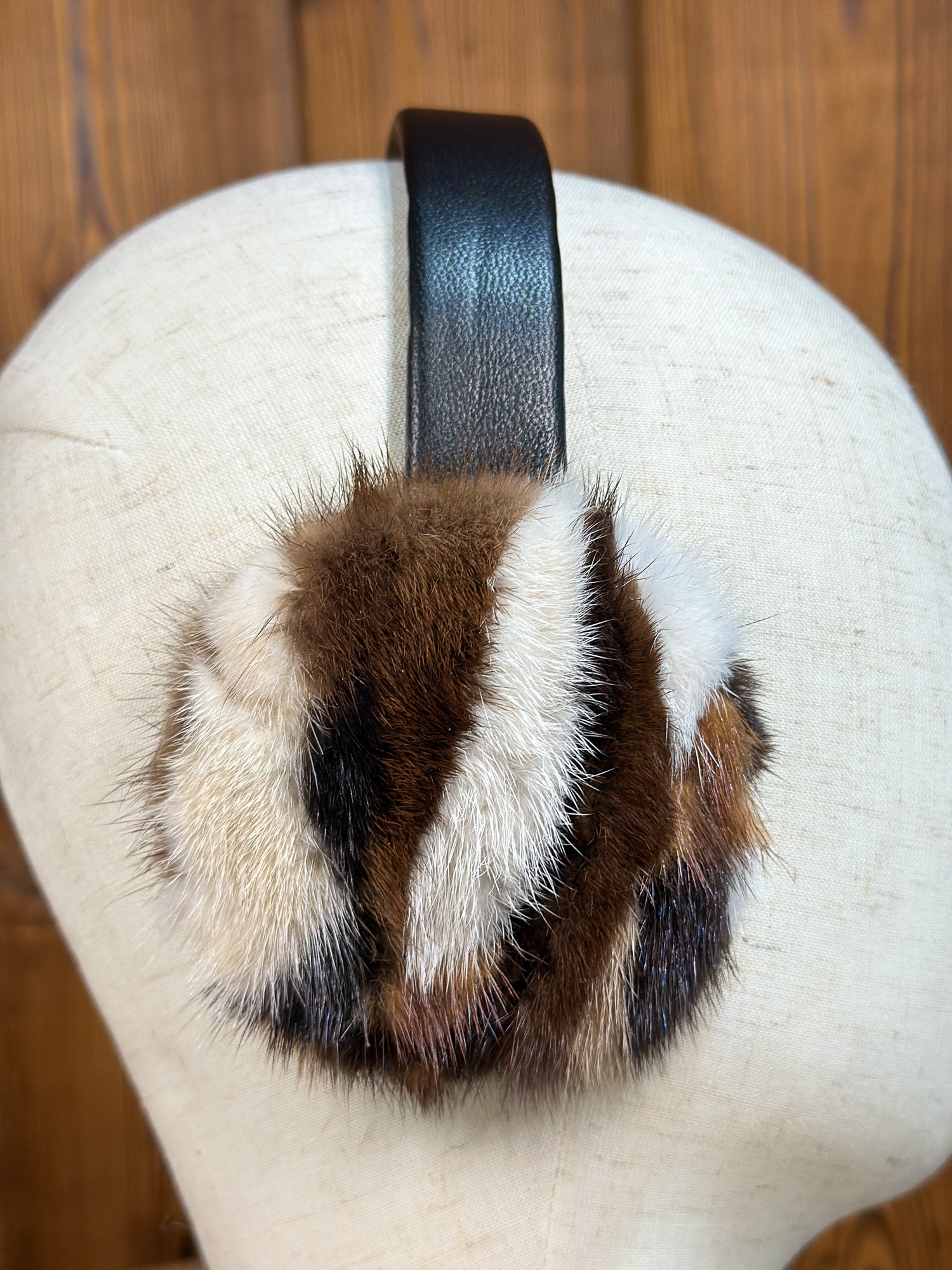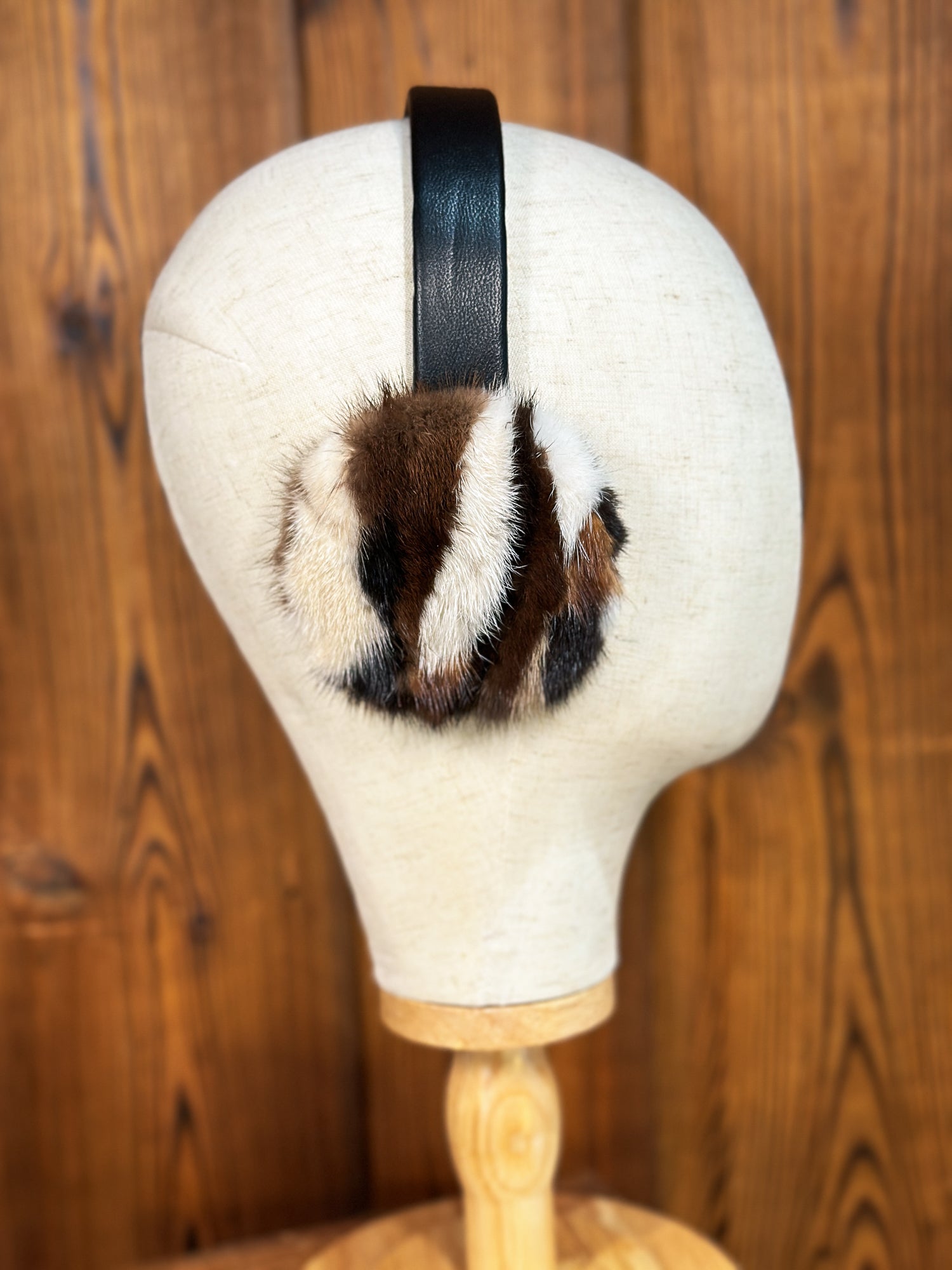 Cache-oreilles recouvert de fourrure recyclée, le motif est le résultat de l'assemblages d'une multitude de retailles de vison,