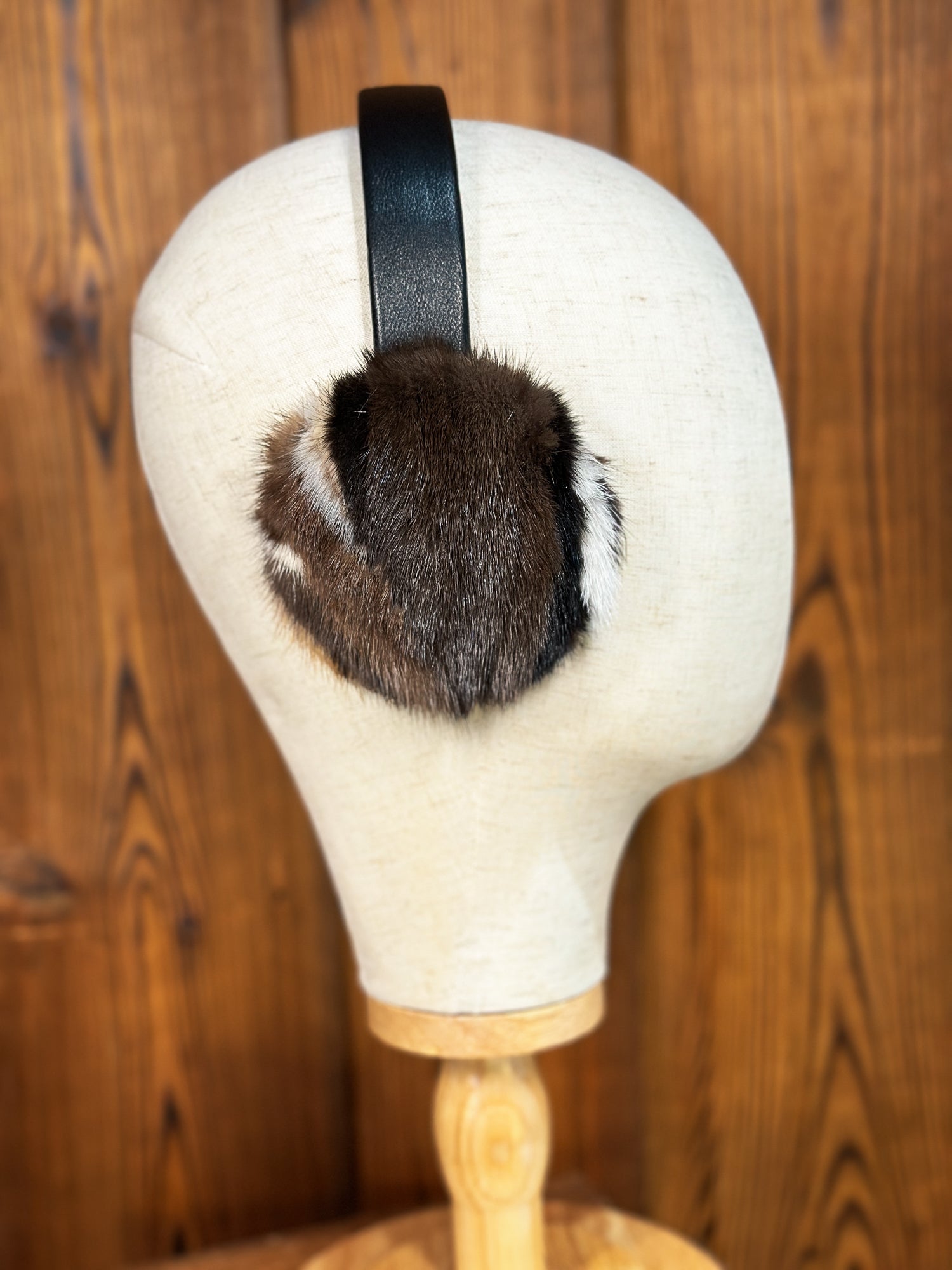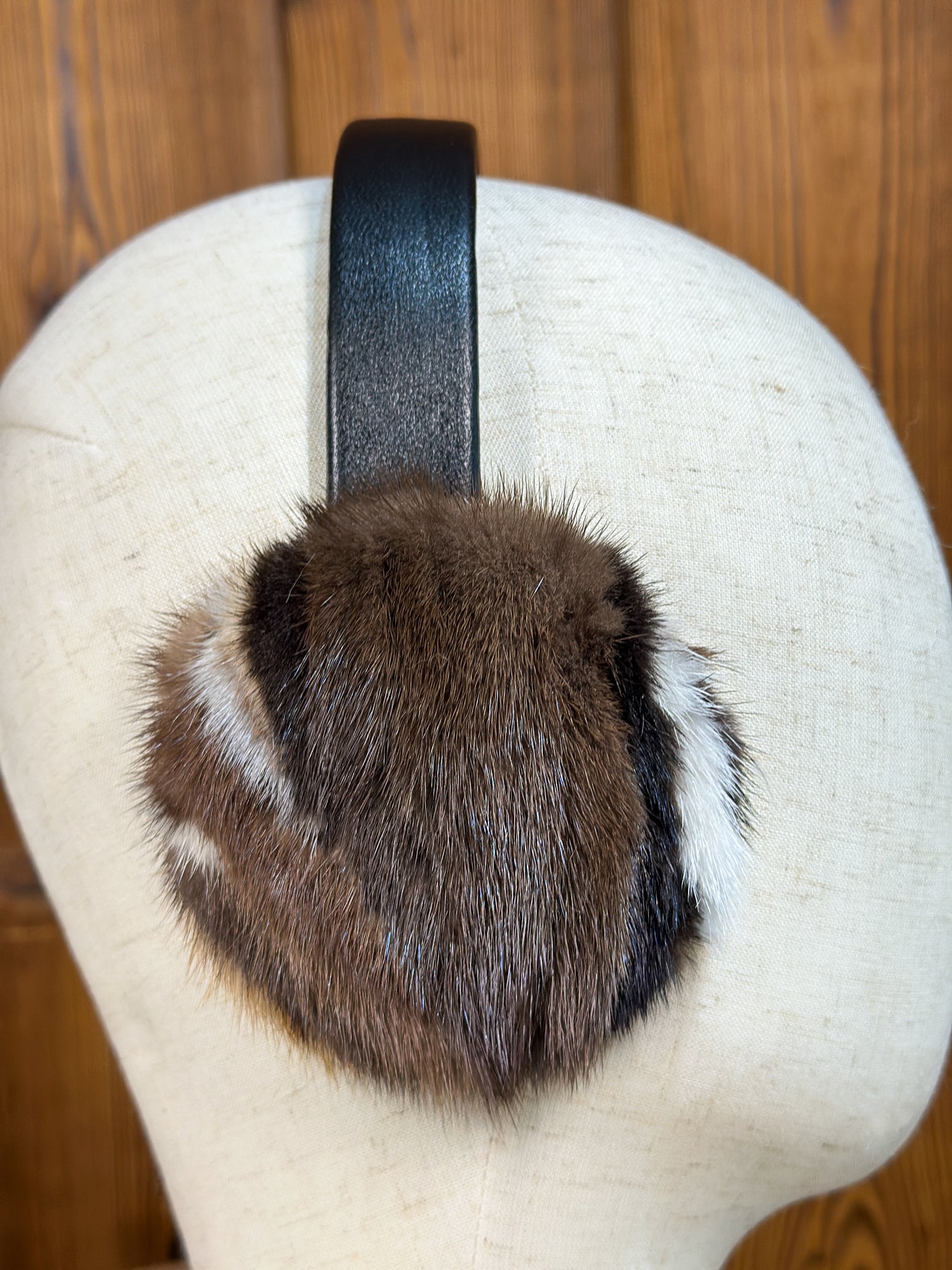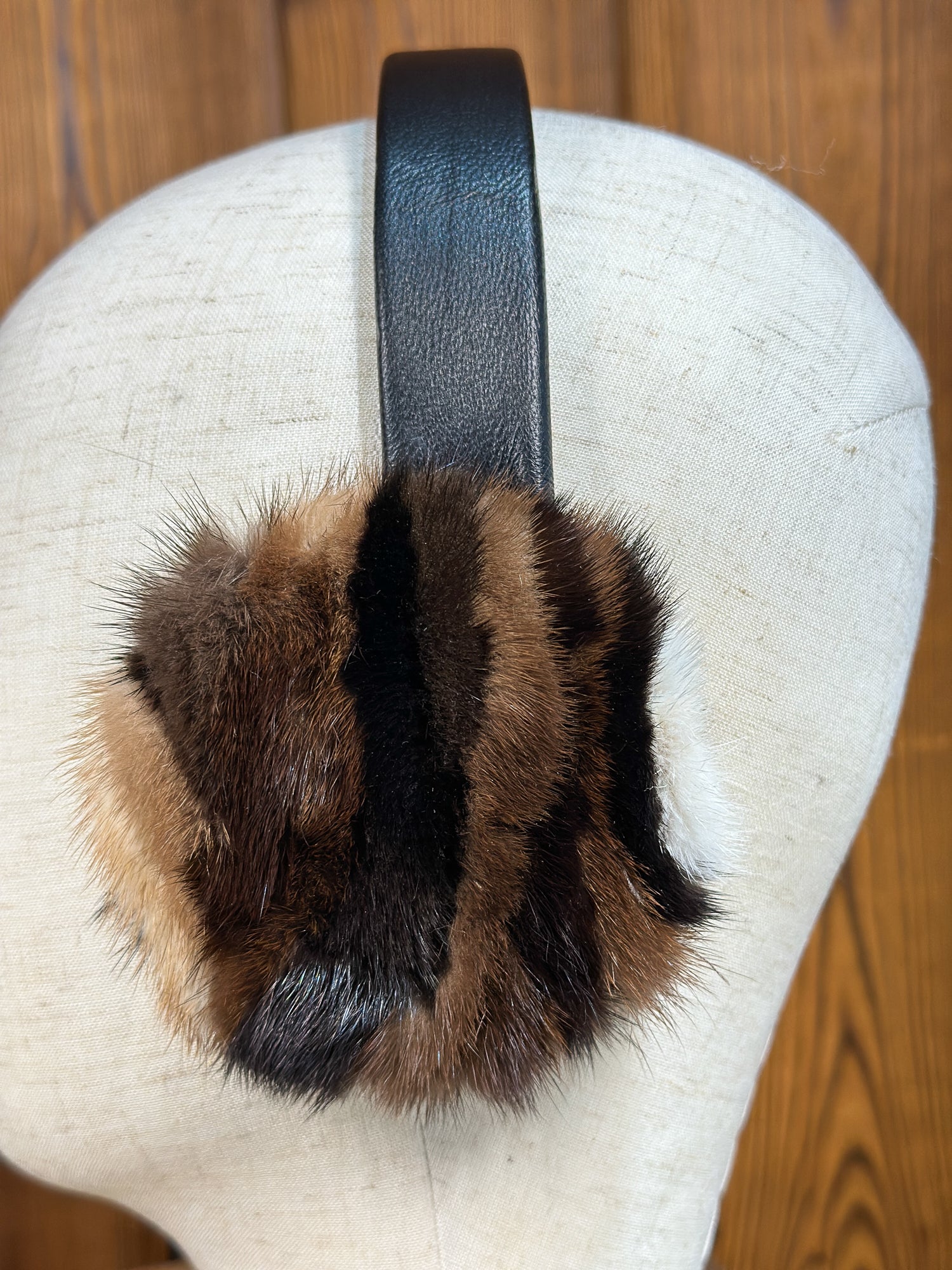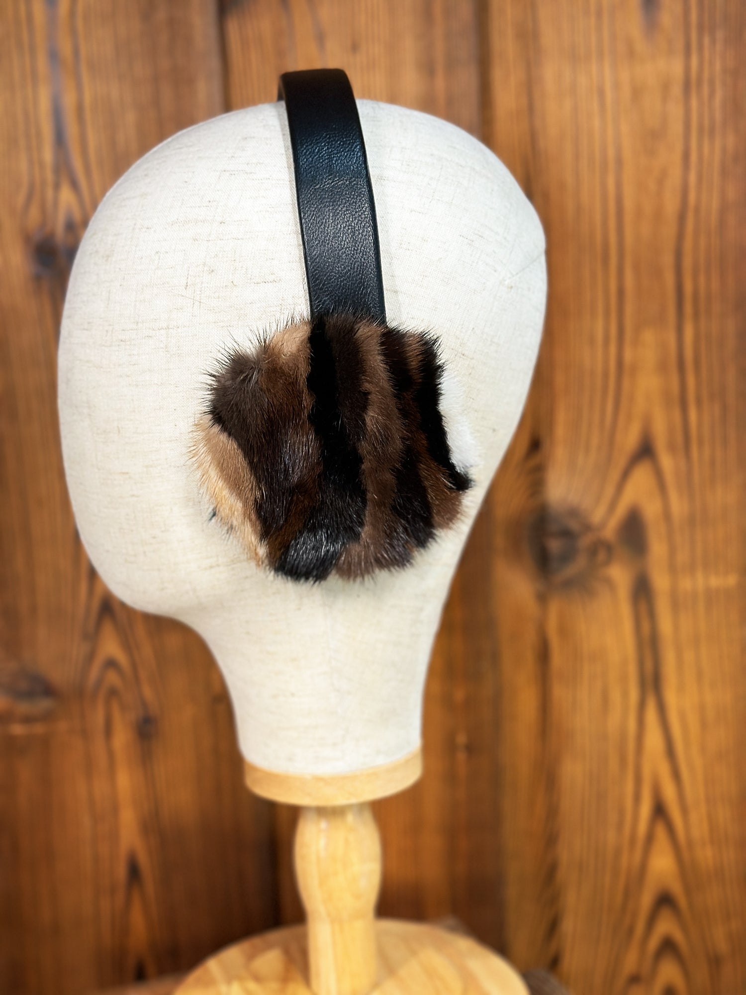 Cache-oreilles recouvert de fourrure recyclée, le motif est le résultat de l'assemblages d'une multitude de retailles de vison.