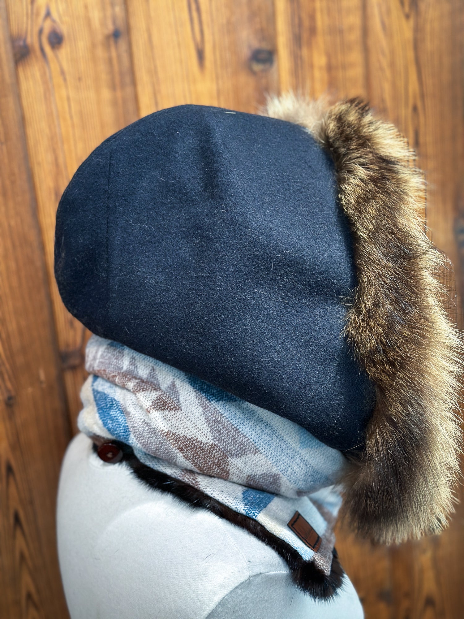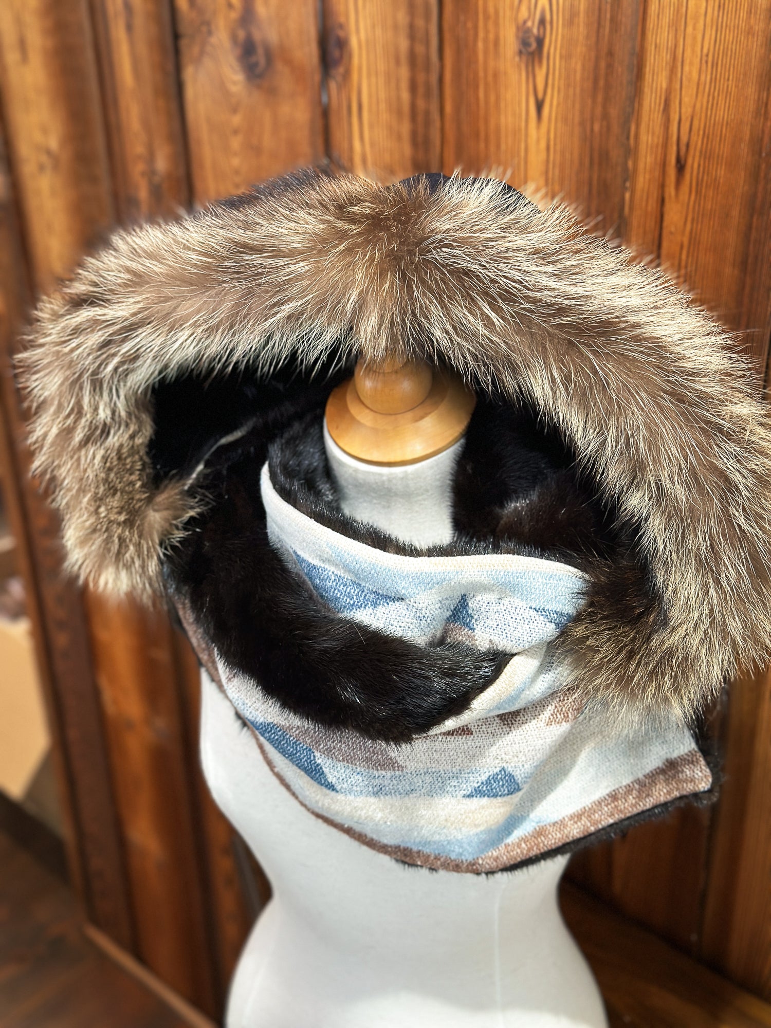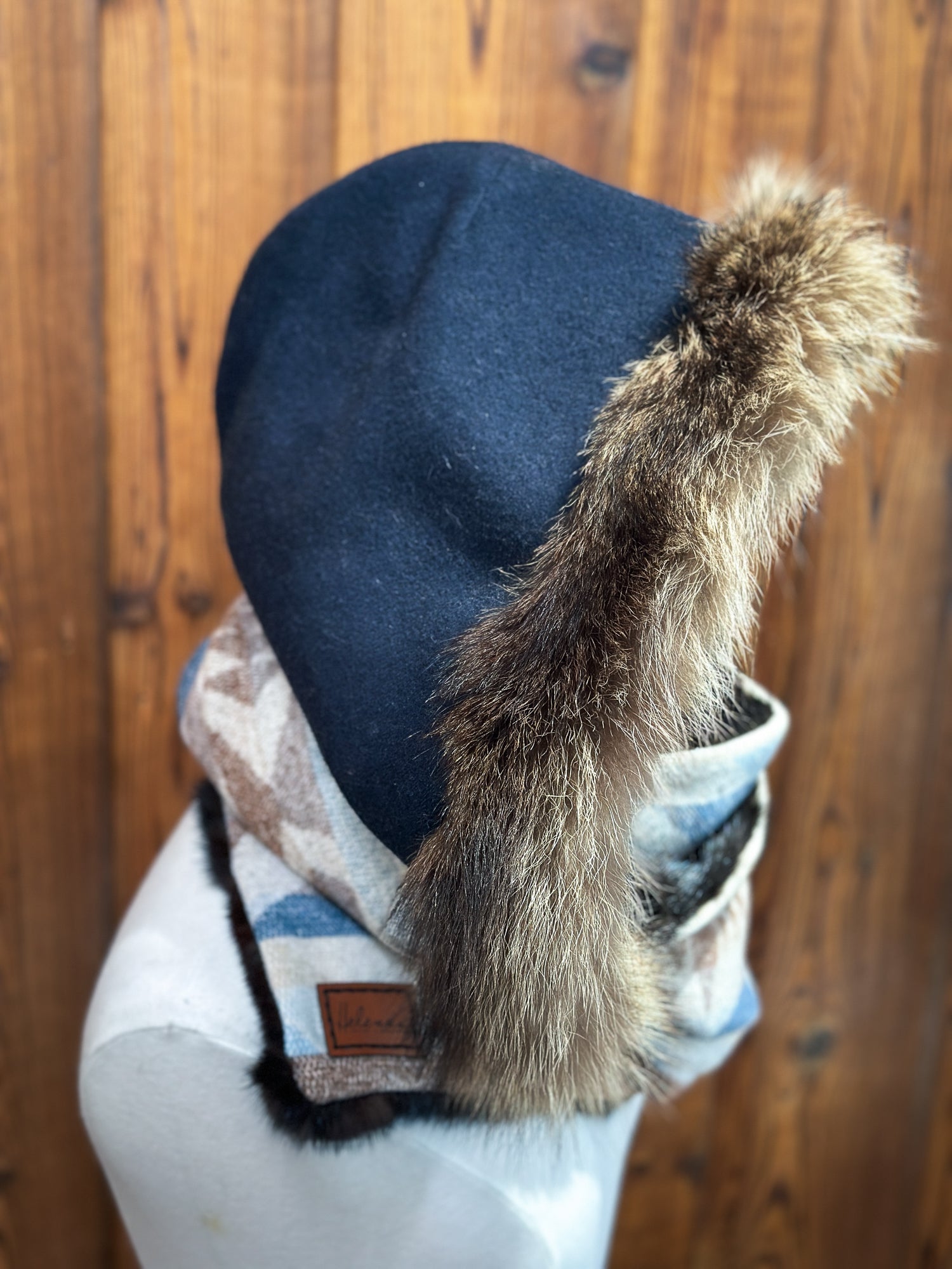 - Capuchon amovible- Marine : Vison brun et chat sauvage- Tissu: 100% Laine