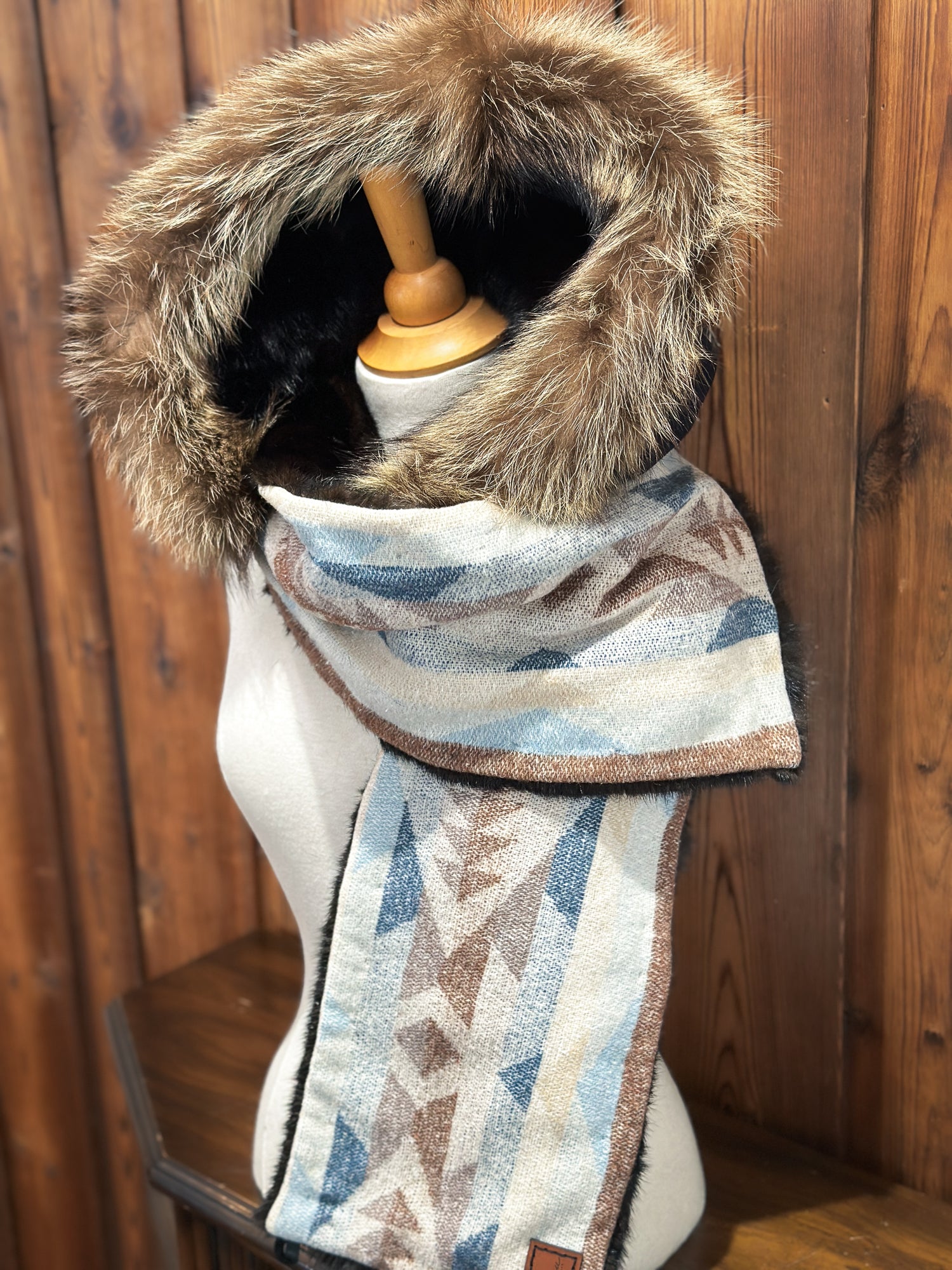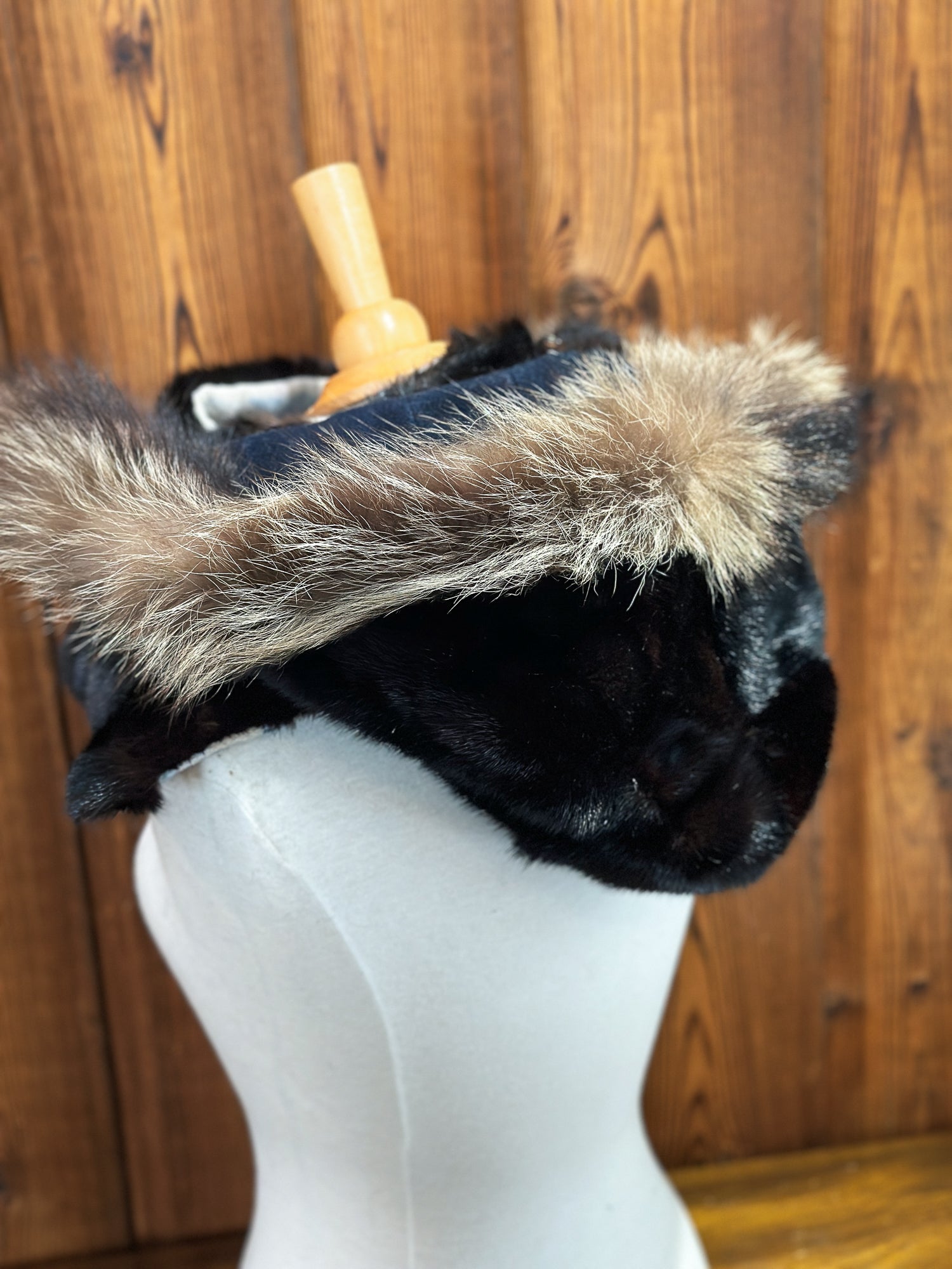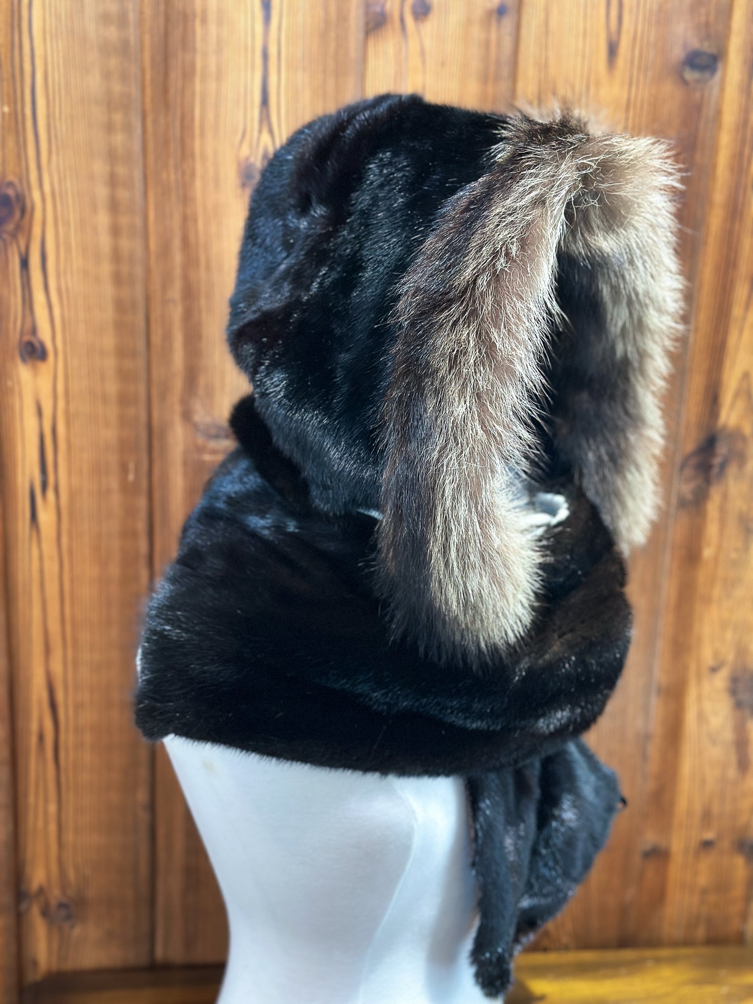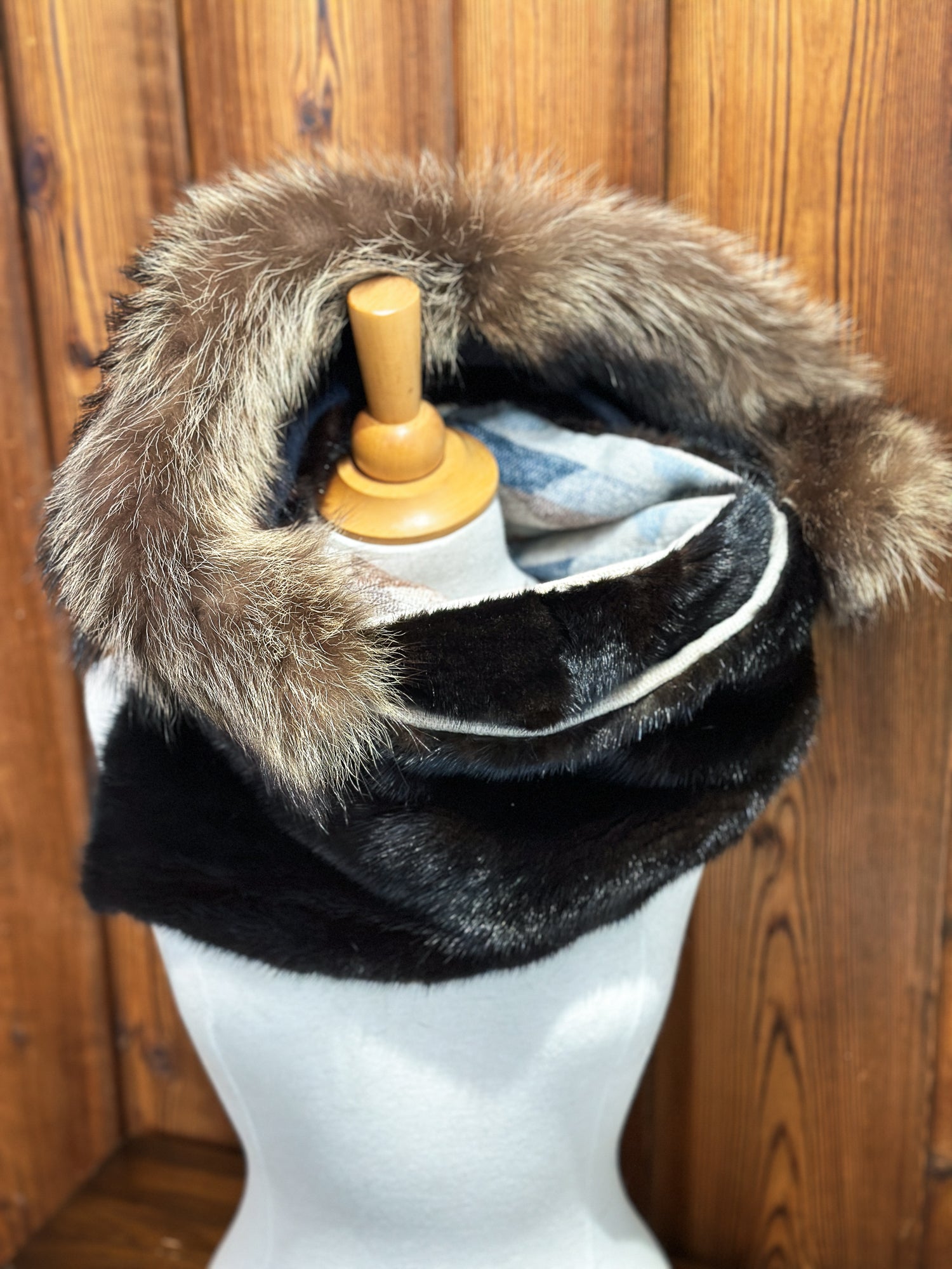 - Capuchon amovible- Marine : Vison brun et chat sauvage- Tissu: 100% Laine