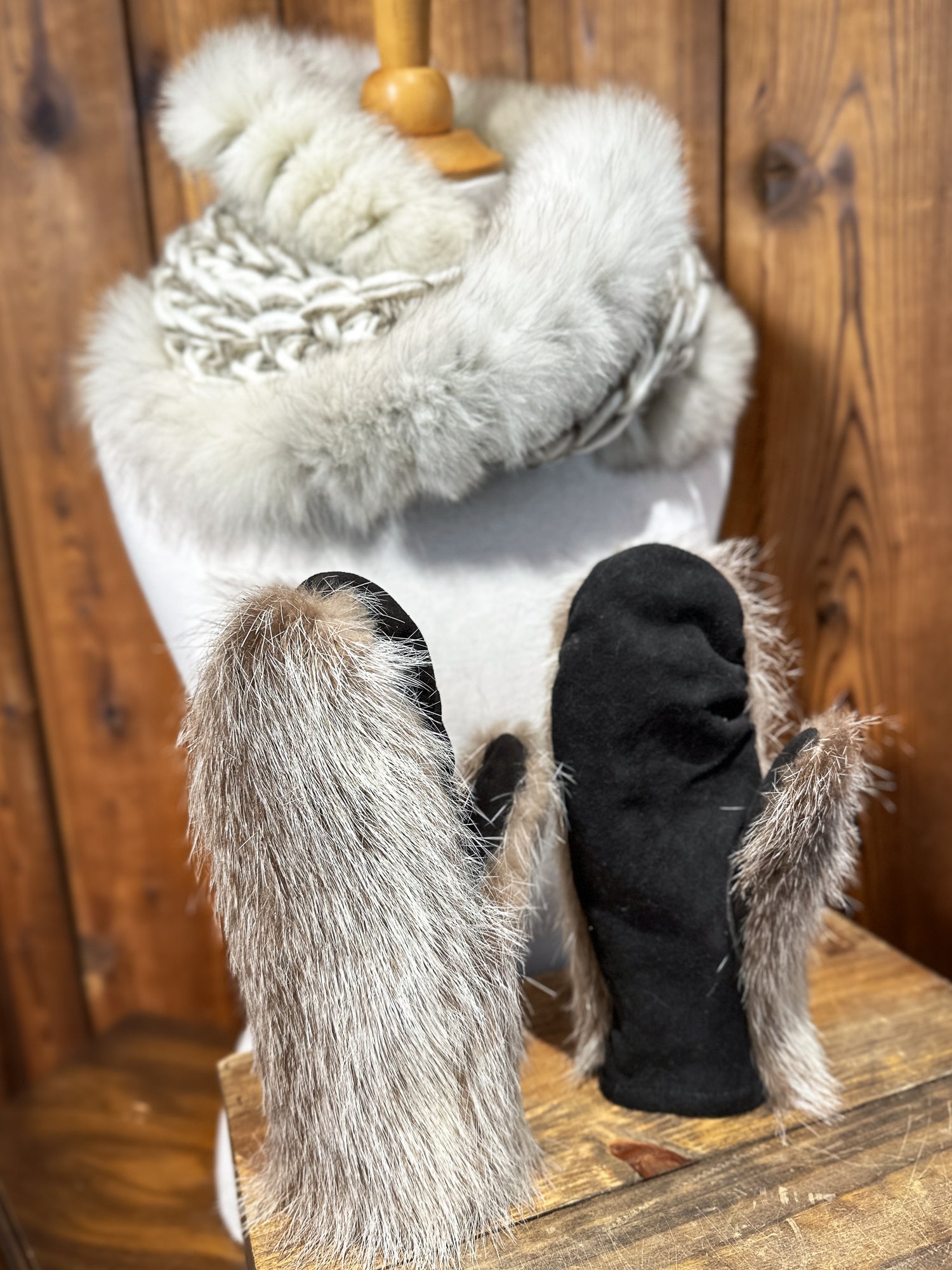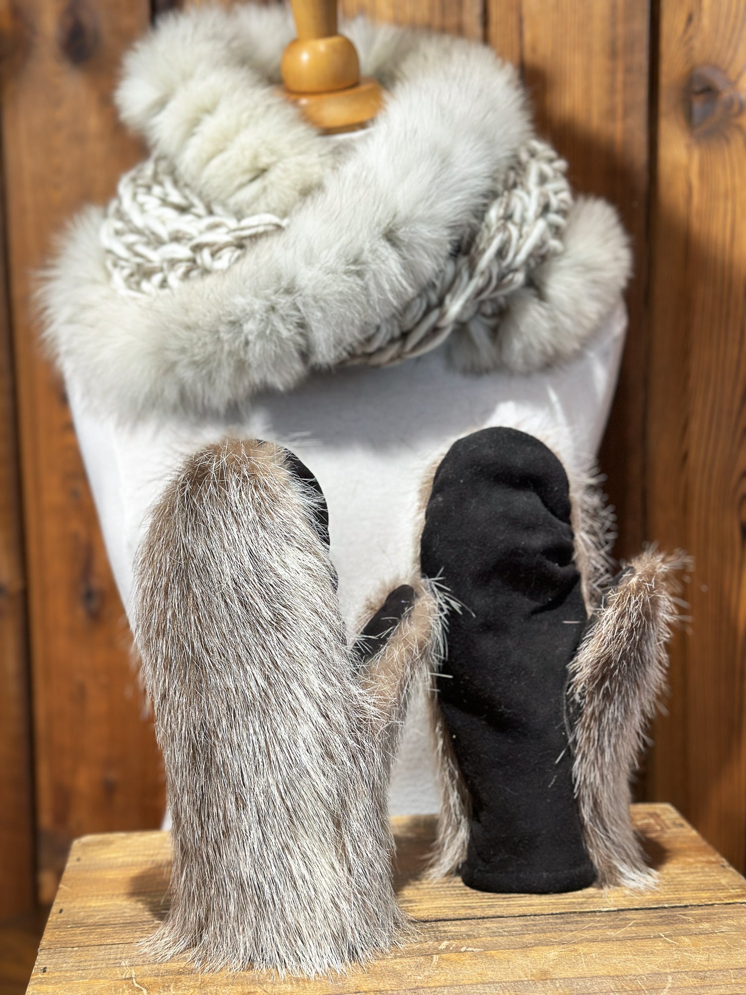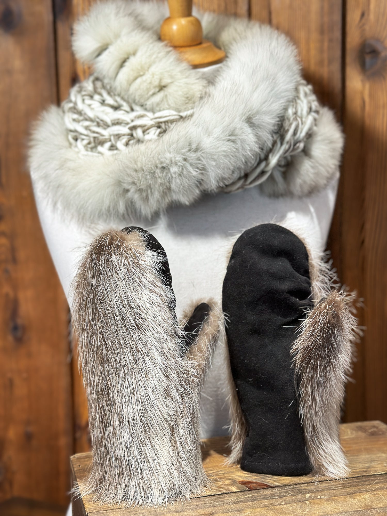 Ensemble Foulard beige et taupe avec fourrure recyclée et mitaines