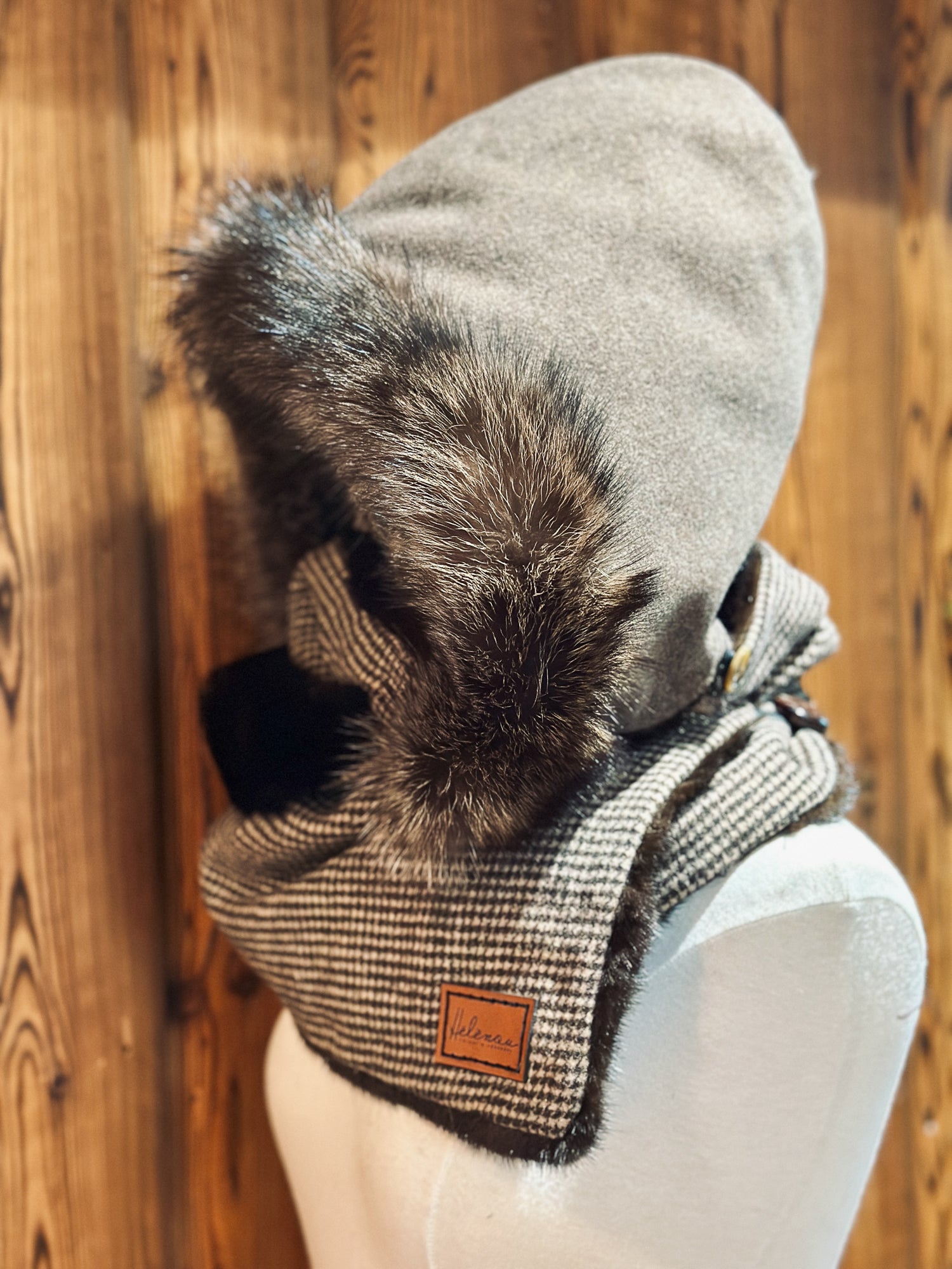 - Capuchon amovible : Vison brun et chat sauvage- Tissu: Mélange laine et alpaga