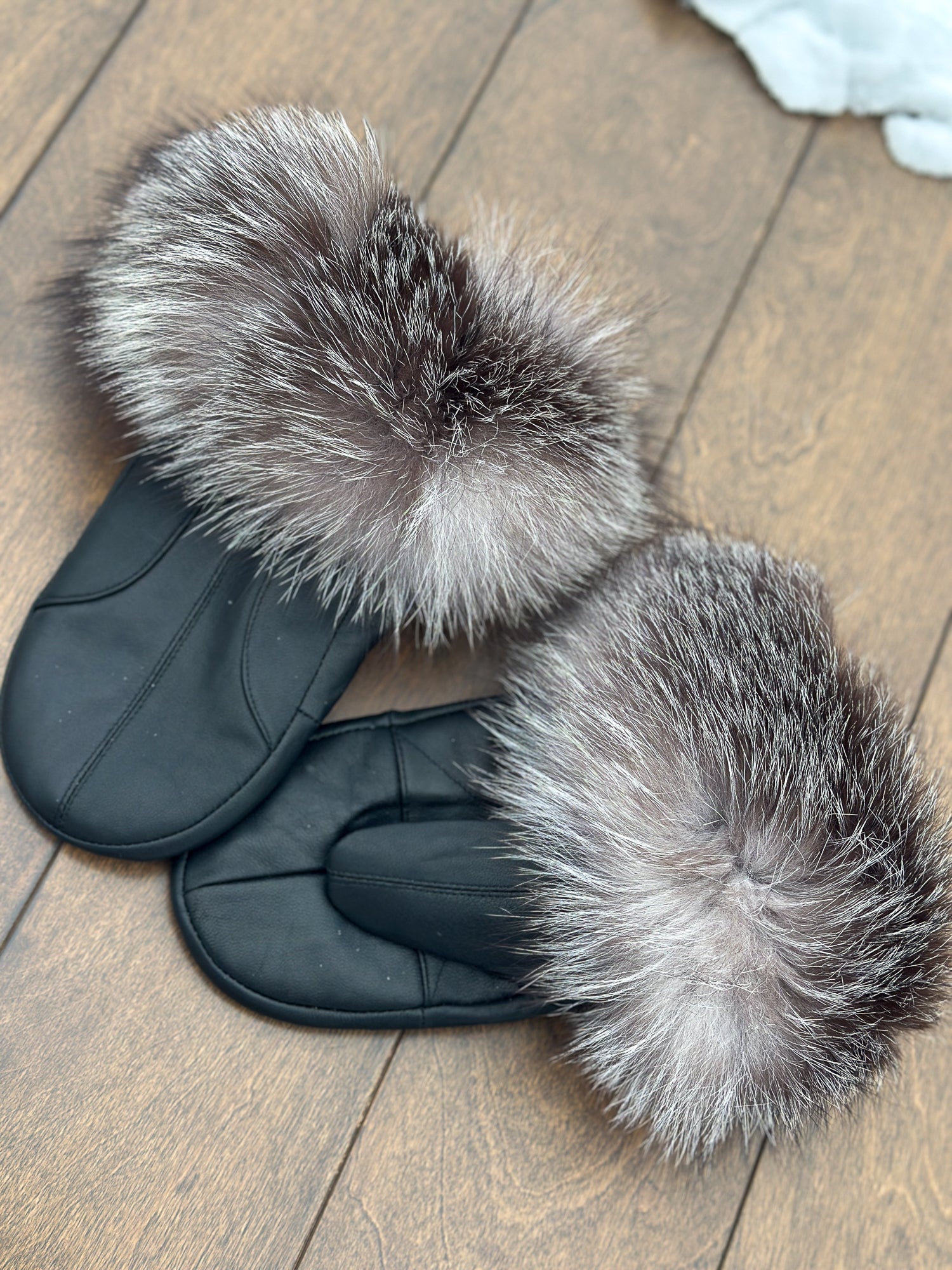 Mitaines en cuir noir avec fourrure recyclée- Renard