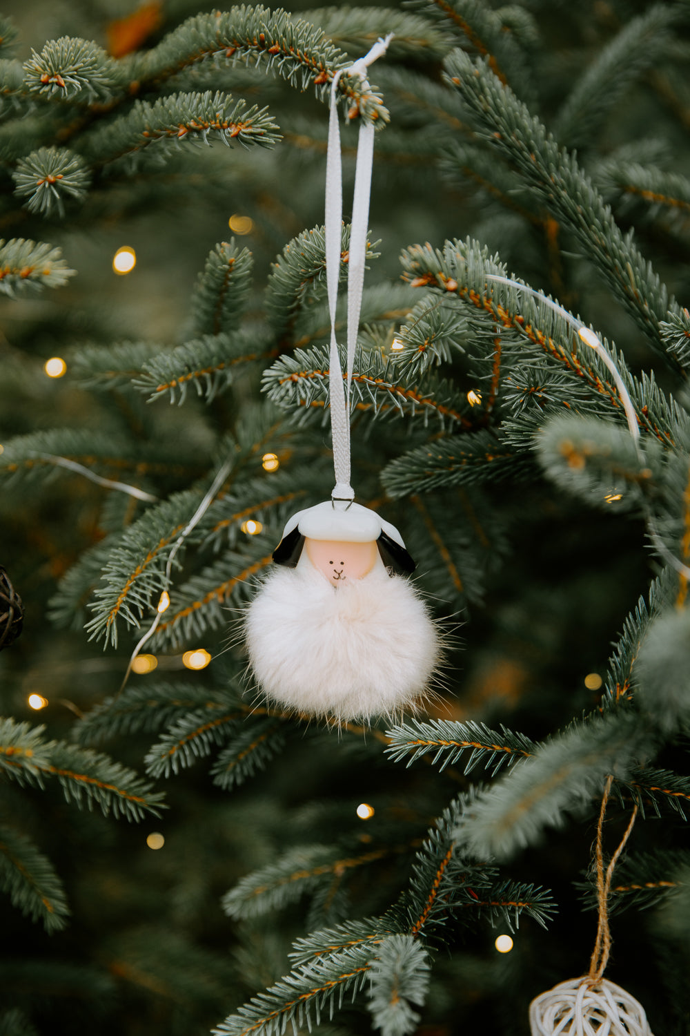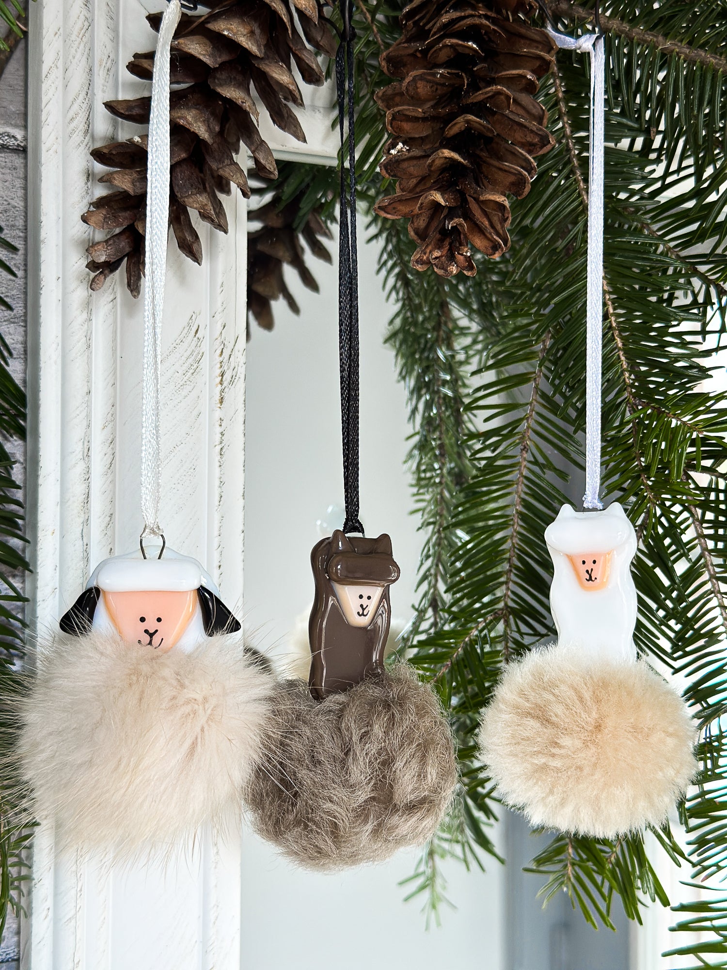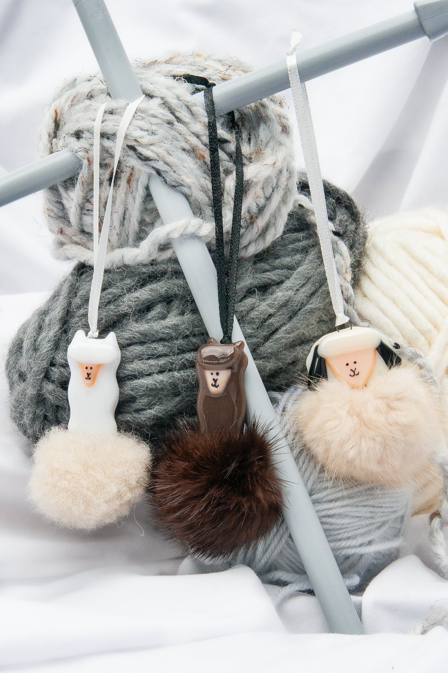 FABRIQUÉ À LA MAIN EN VERRE FUSION ET AGRÉMENTÉ D'UN POMPON DE FOURRURE RECYCLÉE, CES ORNEMENTS CHARMERONT LES AMOUREUSES DE LA FIBRE.