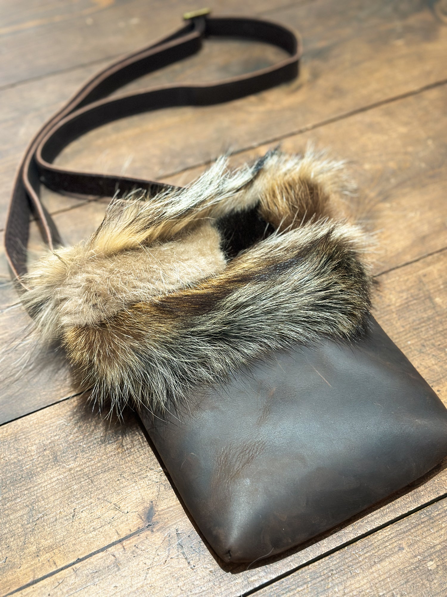 Sac à main en cuir véritable, agrémenté d'un rabat unique en fourrure recyclée. Chaque pièce est unique, créée à partir d'une mosaïque de retailles de fourrure assemblées avec soin pour former une façade originale.